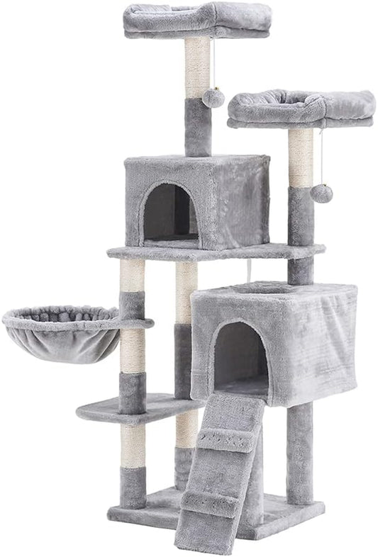 • 58'' Multi-Level Cat Tree – with Hammock, Plush Condos & Sisal Scratching Posts (Light Gray)