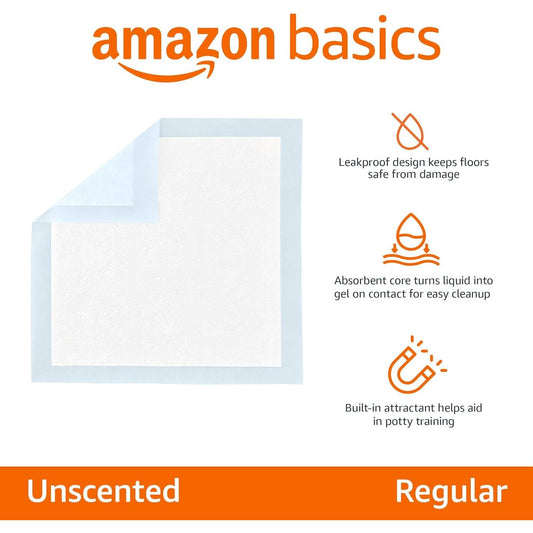 Amazon Basics Leak-Proof Super Absorbent Dog and Puppy Training Pads, 5-Layer Quick-Dry Solution, Regular Size (22x22"), 50 Count, Blue & White
